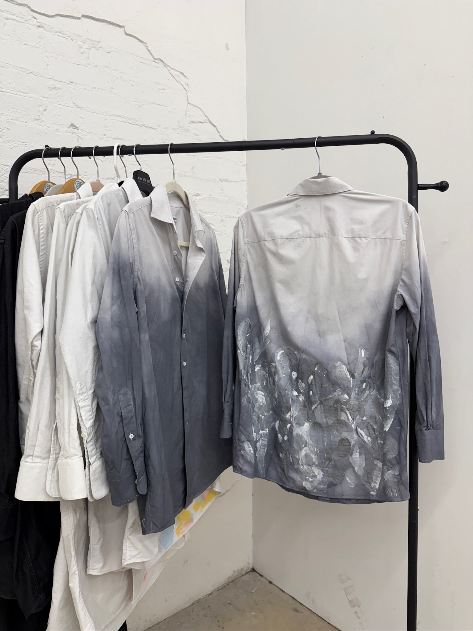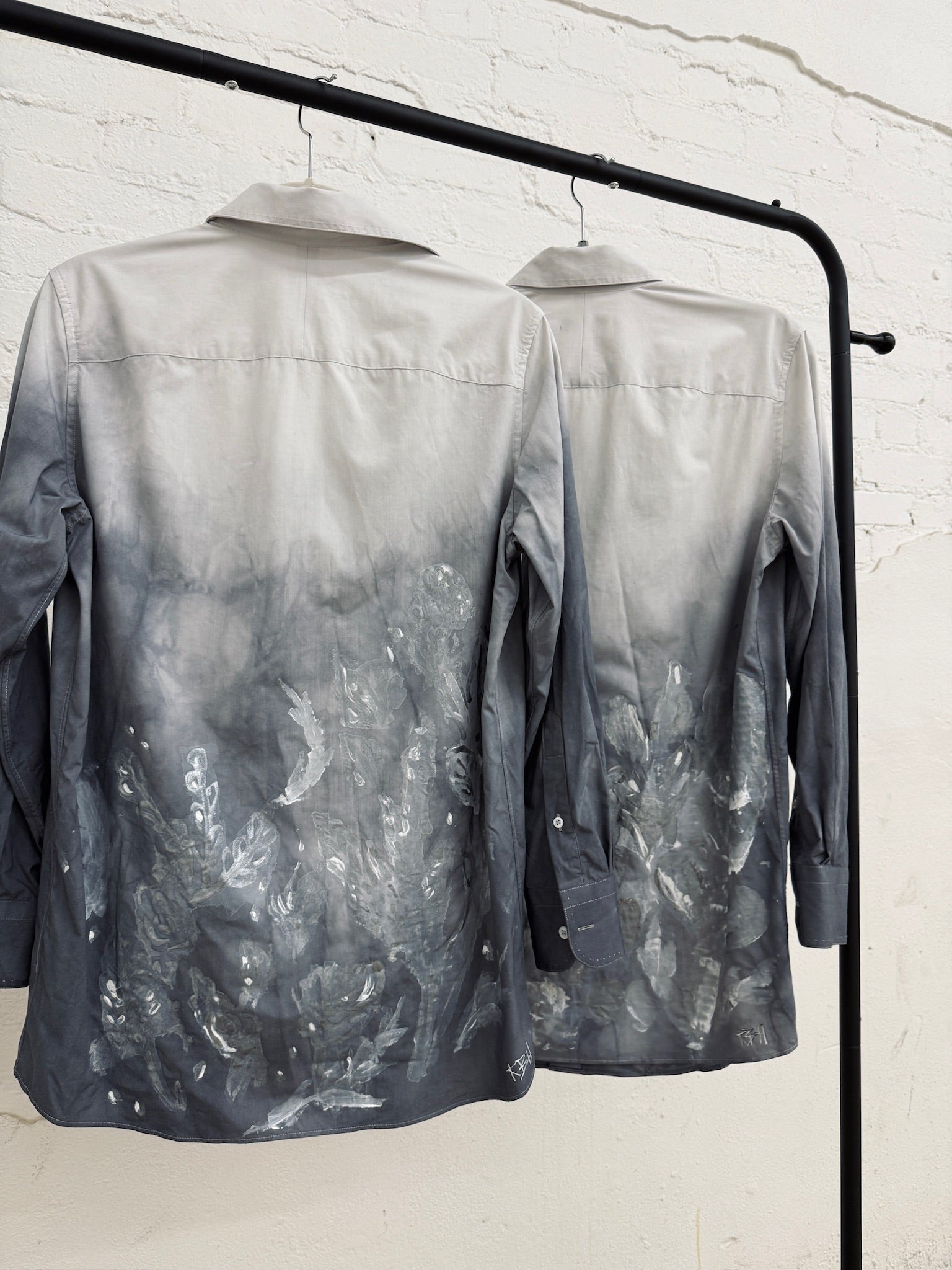 From the limited WYAO collab with BB. A one of a kind, hand painted ‘Lauren’ style boyfriend shirt crafted from a soft bamboo blend. This piece features and ombré grey, dip-dye finish, and a silver metallic foliage painting across the back - blending fashion and fine art into a wearable statement.
