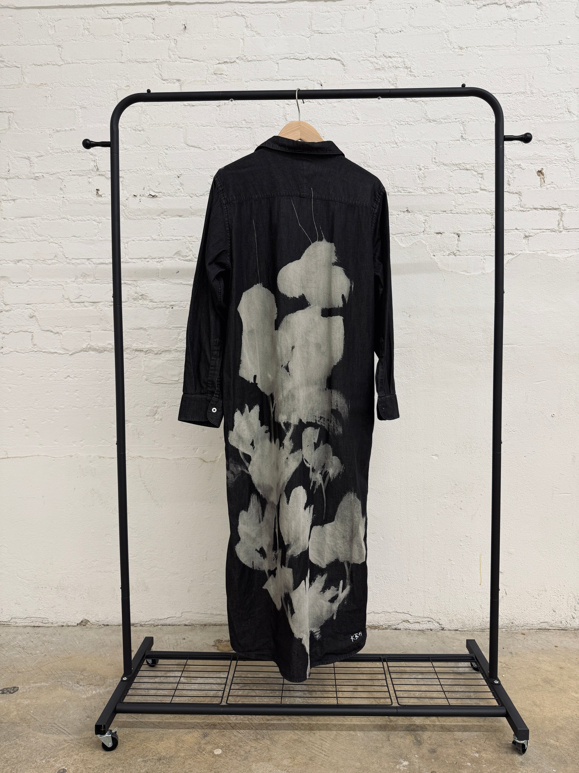 From the limited WYAO collab with BB. A one of a kind, bleach-painted BB shirt dress crafted in 100% cotton, black fabric. This piece features an abstract, floral design across the back - blending fashion and fine art into a wearable statement.
