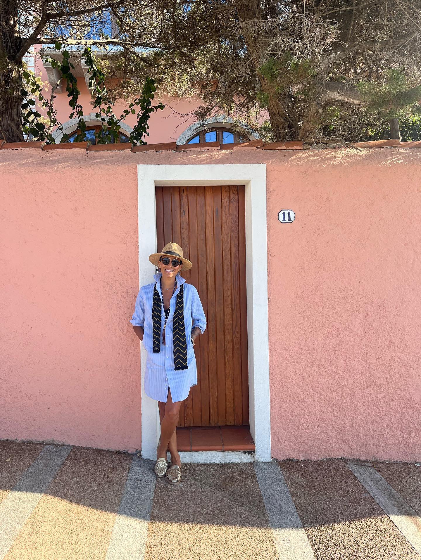 We LOVE summer fabrics especially the blue seersucker which we have in a shirt & in two different shirtdress lengths!!! She is wearing the Susan in Italy for a little coastal fun - She styled it perfectly with sunglasses, a straw hat, flats, & a summer scarf that adds a little dimension!